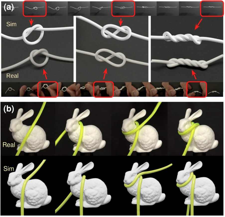 Physics validation: robot-driven rope motion with motion capture comparison.