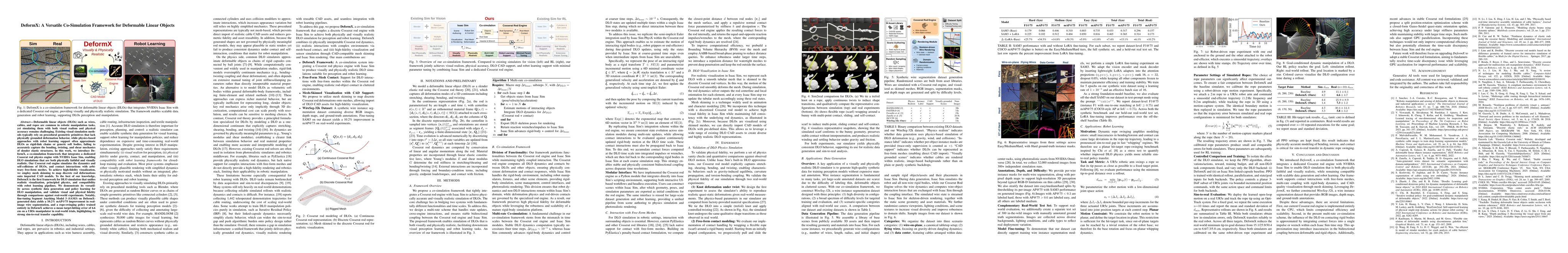 Simulating deformable linear objects (DLOs) such as wires, cables, and ropes with both visual realism and physical accuracy remains a significant challenge. We present DeformX, a co-simulation framework integrating a Cosserat rod physics engine with NVIDIA Isaac Sim. DeformX simulates dynamics, self-collisions, and interactions with free-form meshes, while using mesh skinning to map rod deformations to CAD models for high-fidelity visualization. It is the first framework combining realistic visualization, principled physics, and robot learning compatibility.