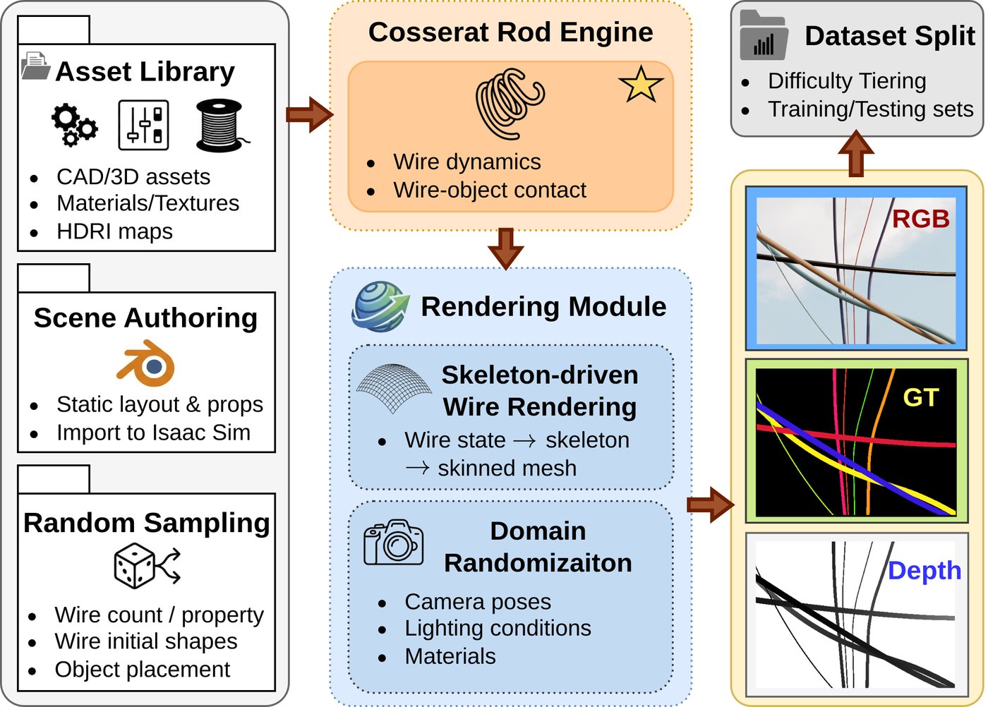 32,000 synthetic images from 300+ simulation runs across Easy/Medium/Hard tiers in wire-on-plane, flying wires, and data center scenarios.